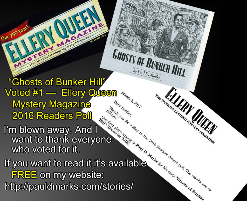 I’m thrilled to announce that my story “Ghosts of Bunker Hill,” from the December, 2016, Ellery Queen Mystery Magazine, has been nominated/short listed for a 2017 MACAVITY AWARD and was voted #1 in the ELLERY QUEEN READERS POLL Poll for 2016. The competition for the Macavity is really stiff. The other nominees in the short story category are: Lawrence Block, Craig Faustus Buck, Greg Herren, Joyce Carol Oates and Art Taylor. Wow! You can read “Ghosts of Bunker Hill” and other stories for free on my website at: http://pauldmarks.com/stories/